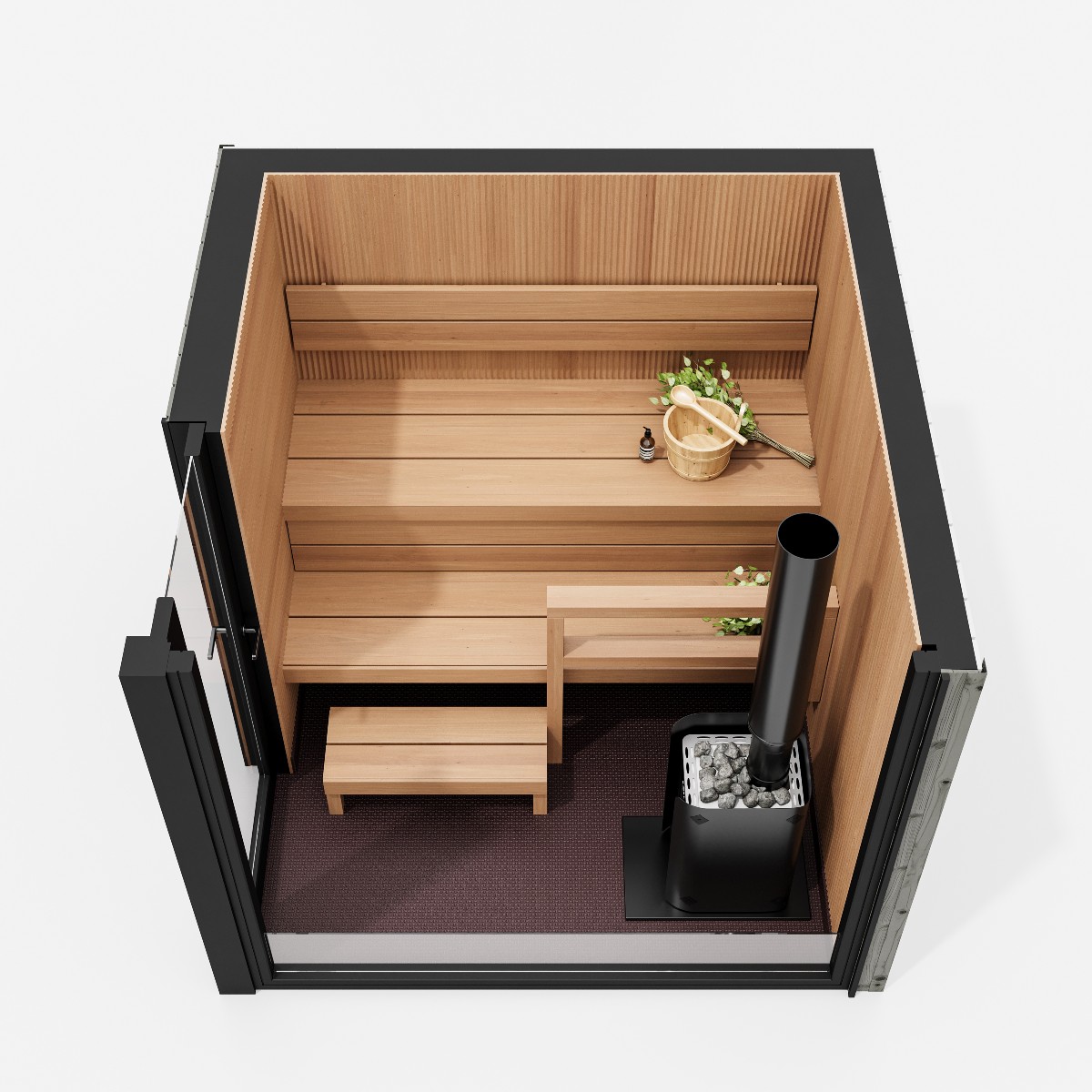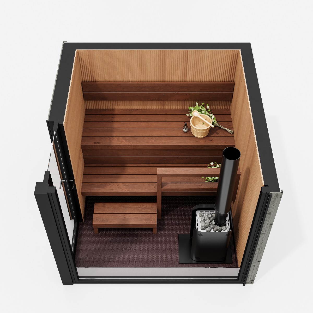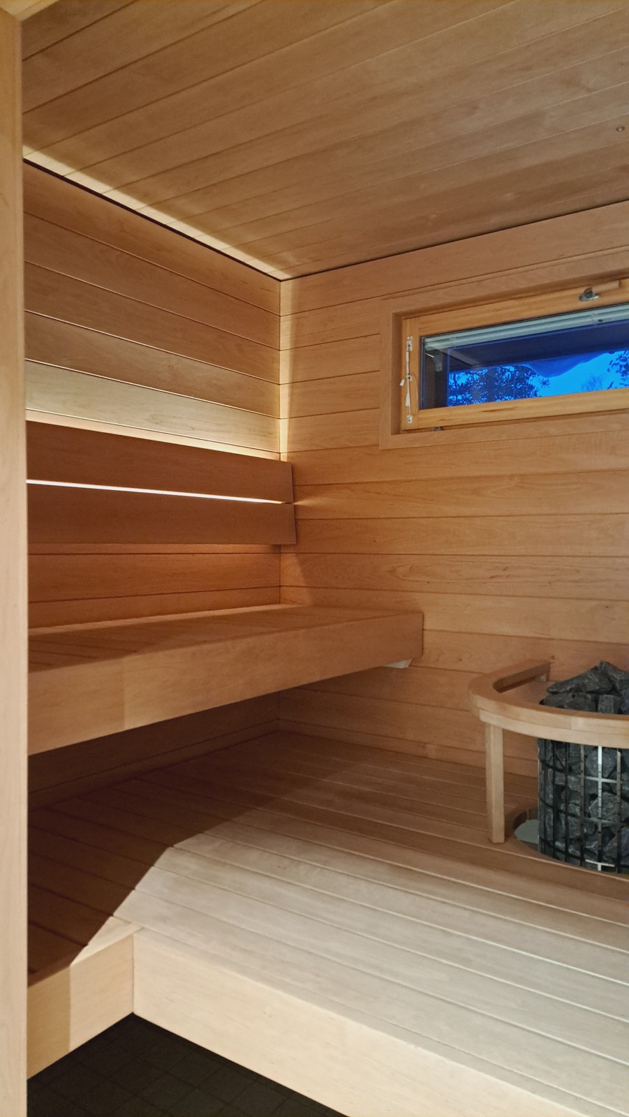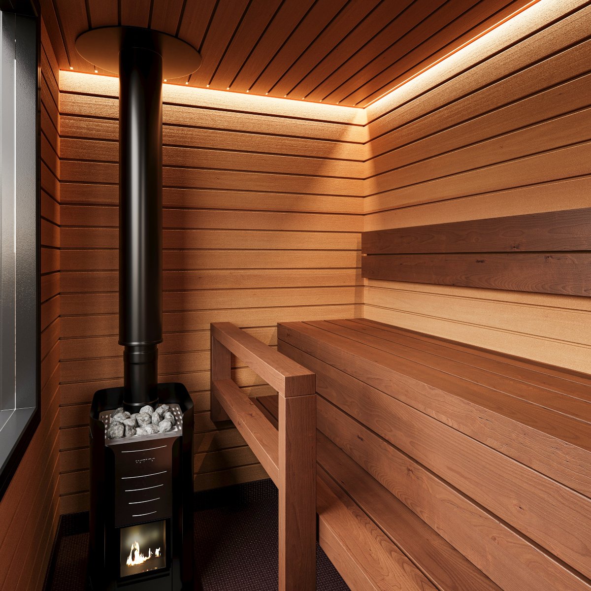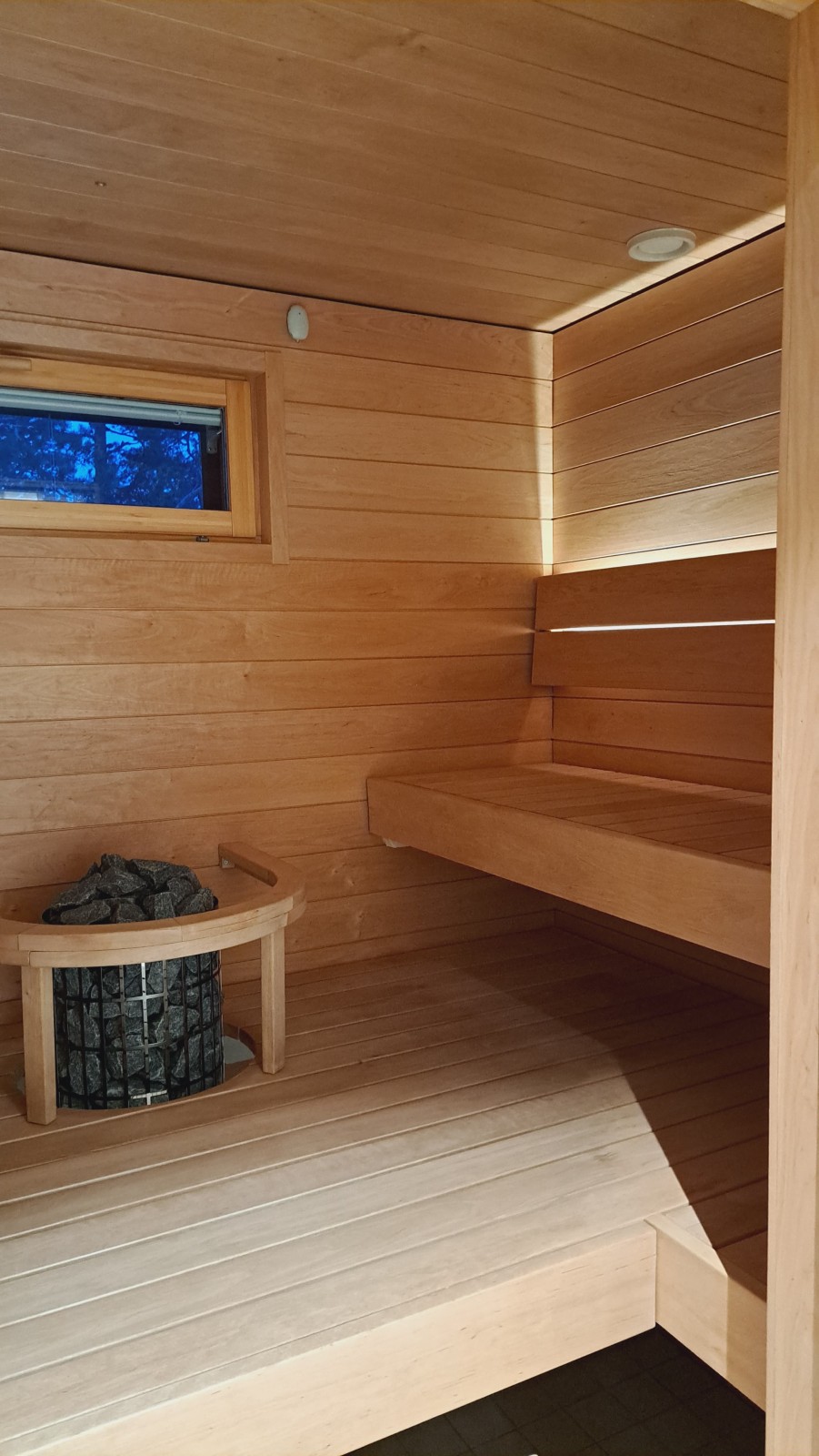 Bastuvagn med hörnbänk: Stark bastulavar, al – Direkt-panel, värmebehandlad asp