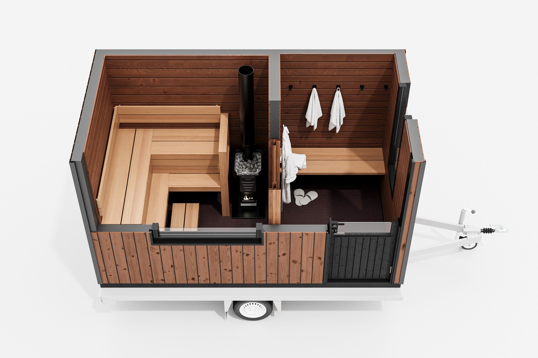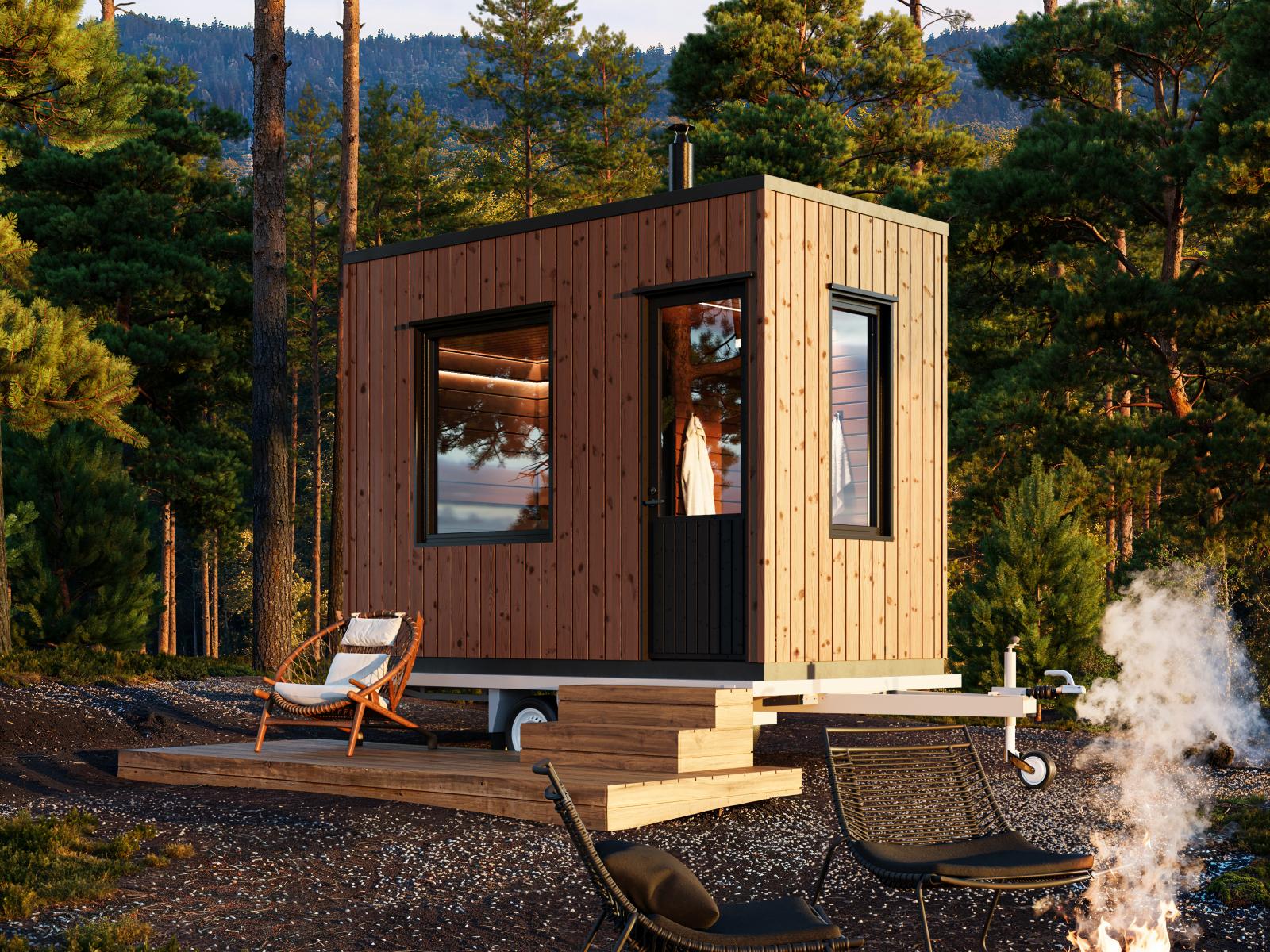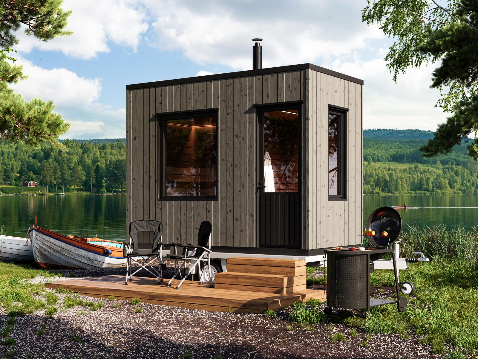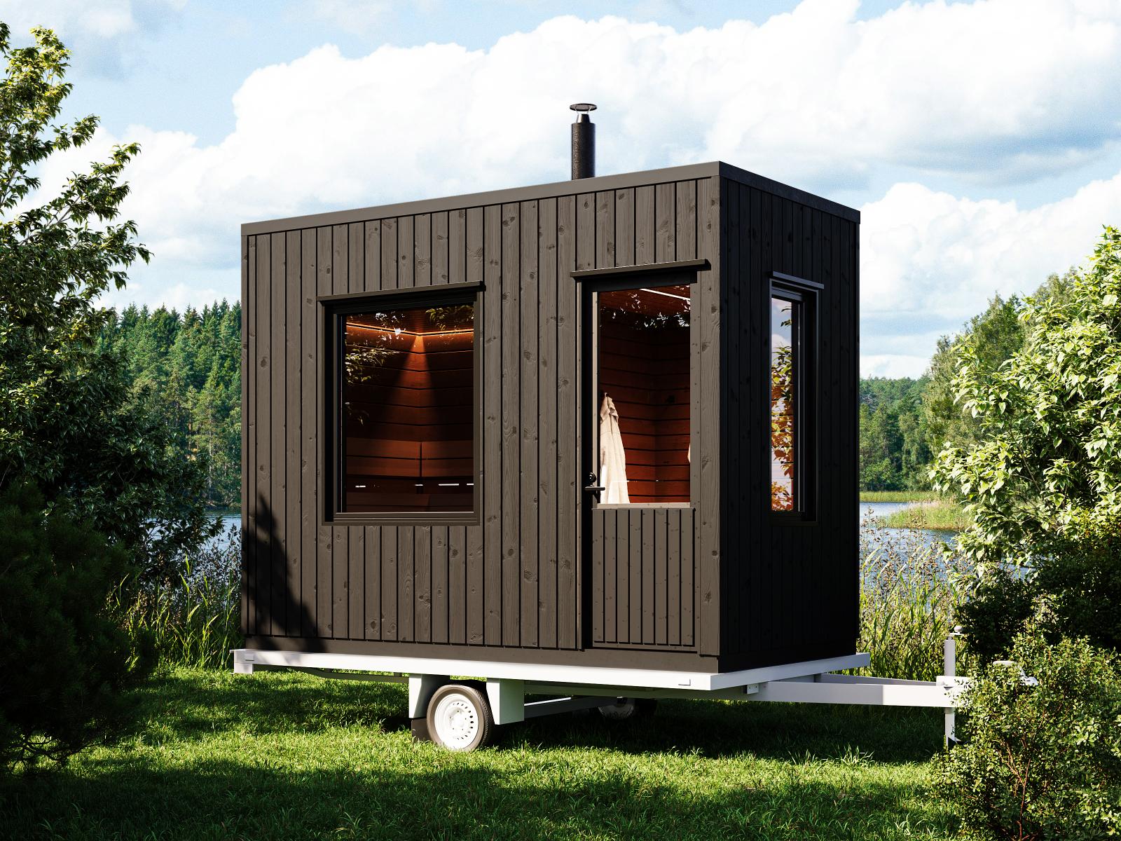 Bastuvagn med rak bänk: Berg bastulavar, värmebehandlad asp – Runda paneler, al