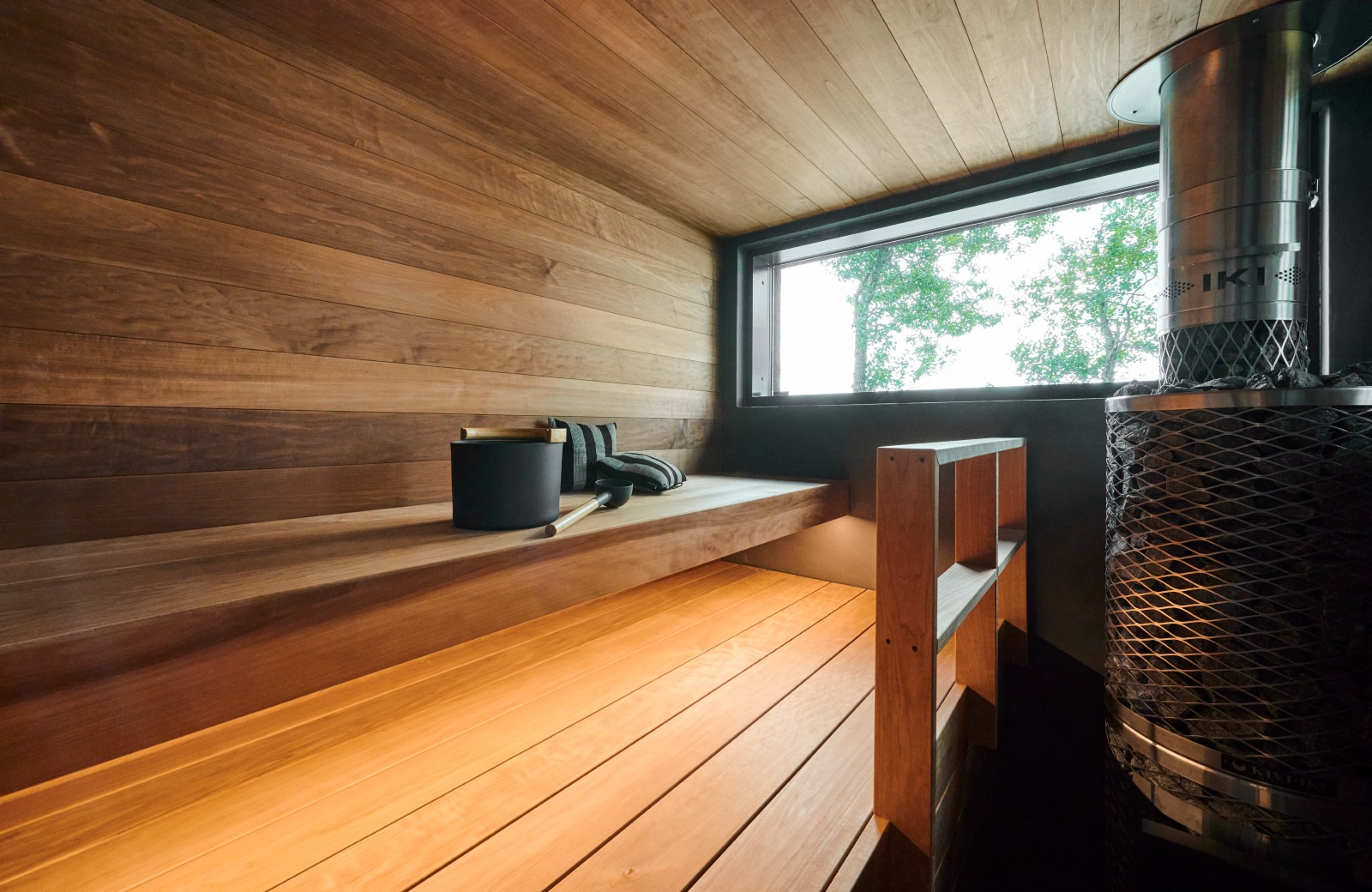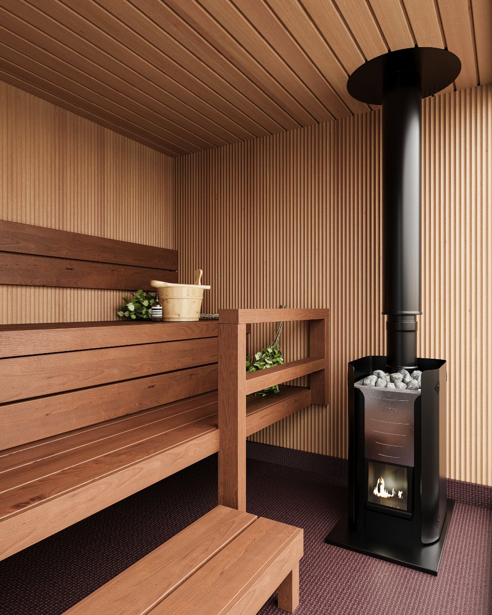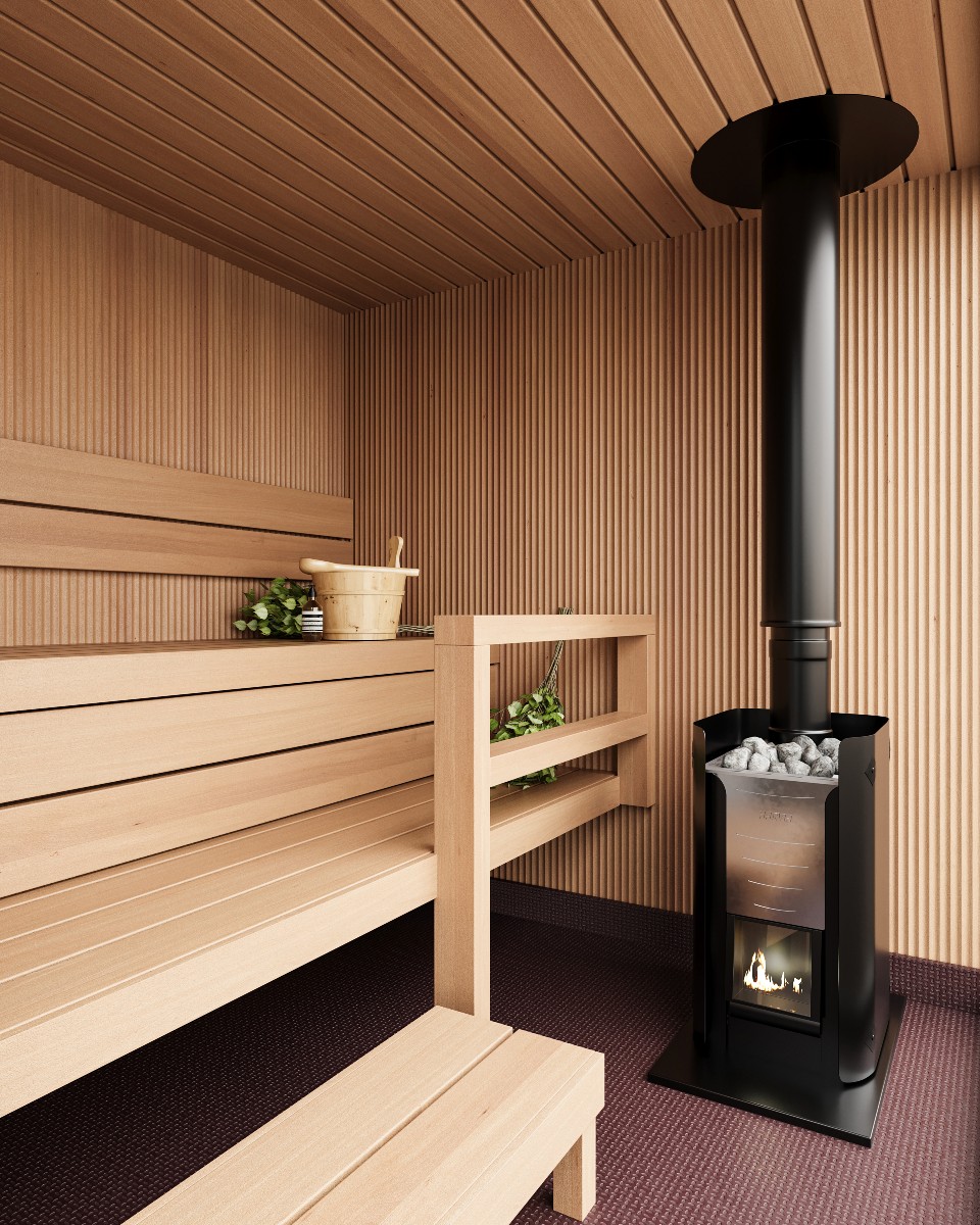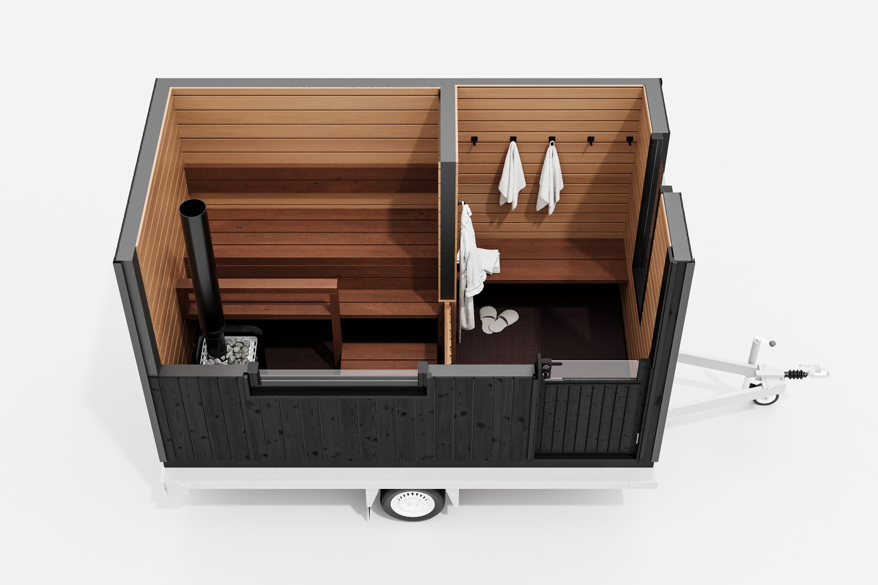 Bastuvagn med rak bänk: Berg bastulavar, värmebehandlad asp – Runda paneler, al