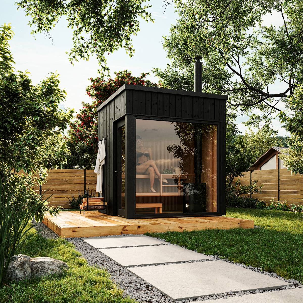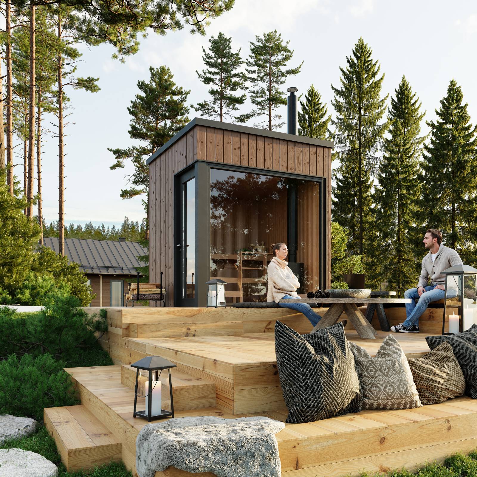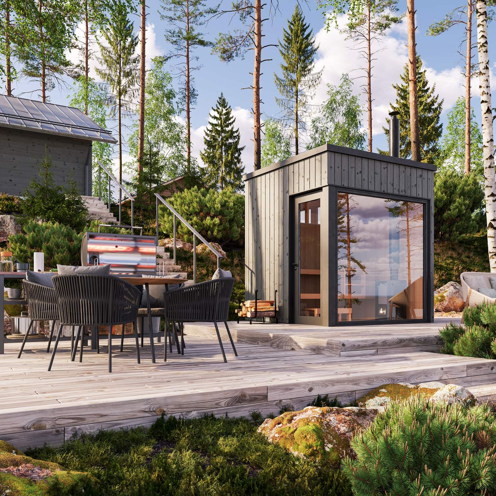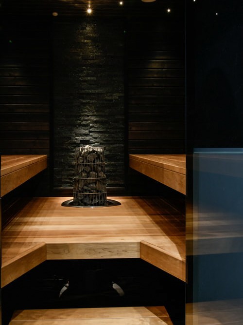 Bastuvagn med rak bänk: Berg bastulavar, värmebehandlad asp – Runda paneler, al